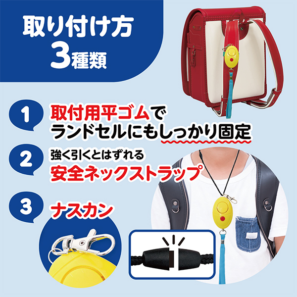 軽量コンパクトで持ち運びやすく、バッグやランドセルに取り付け可能。