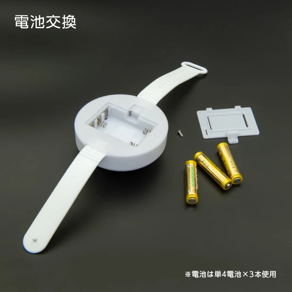 | 製品仕様上の注意点 | ①連続点灯させた場合、一定時間経つと電池の電圧低下によって色味や明るさが変化する場合があります。 電池の性質上、消灯してしばらく時間を置くと電圧が回復し色味が一定量元に戻ります。 ②ご使用中に下記の症状が出た際は、電池残量の低下が考えられますので交換を行ってください。 ・発光色が赤みを帯びる / LEDがレッドしか点灯しない / またはレッドから切り替えができない。 ・電源をOFFにできない / または電源が勝手に落ちる。 |